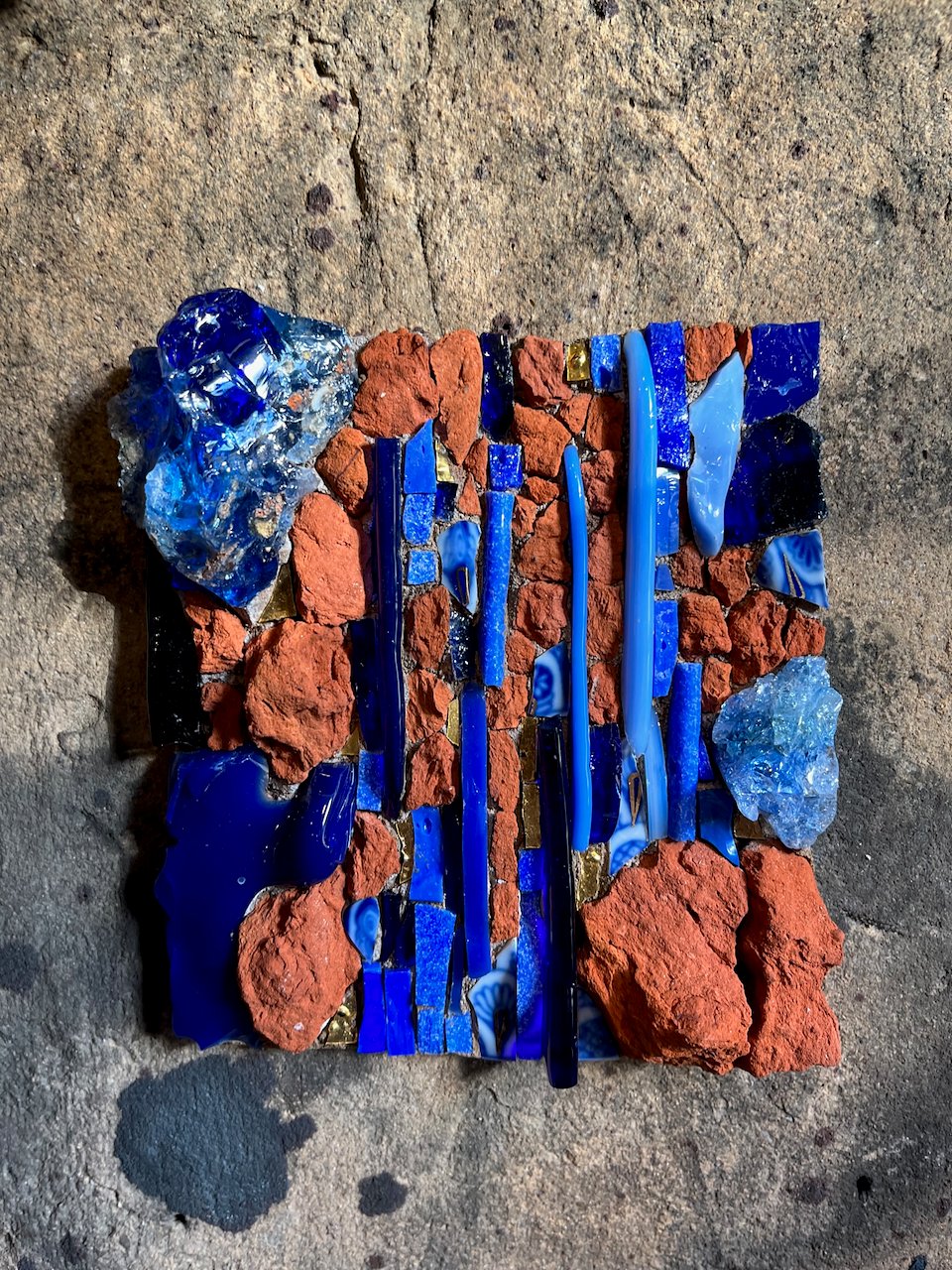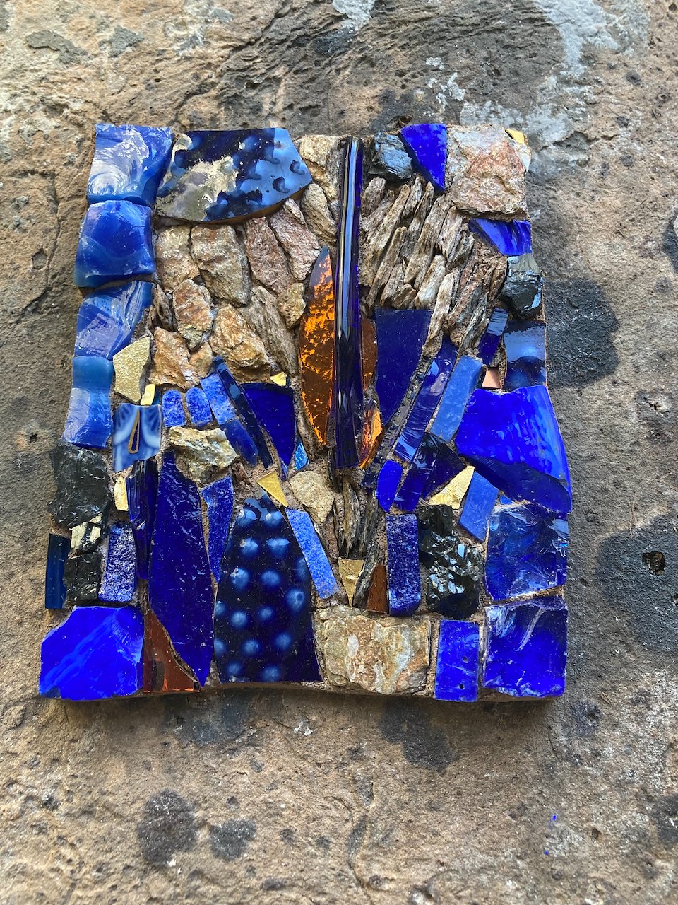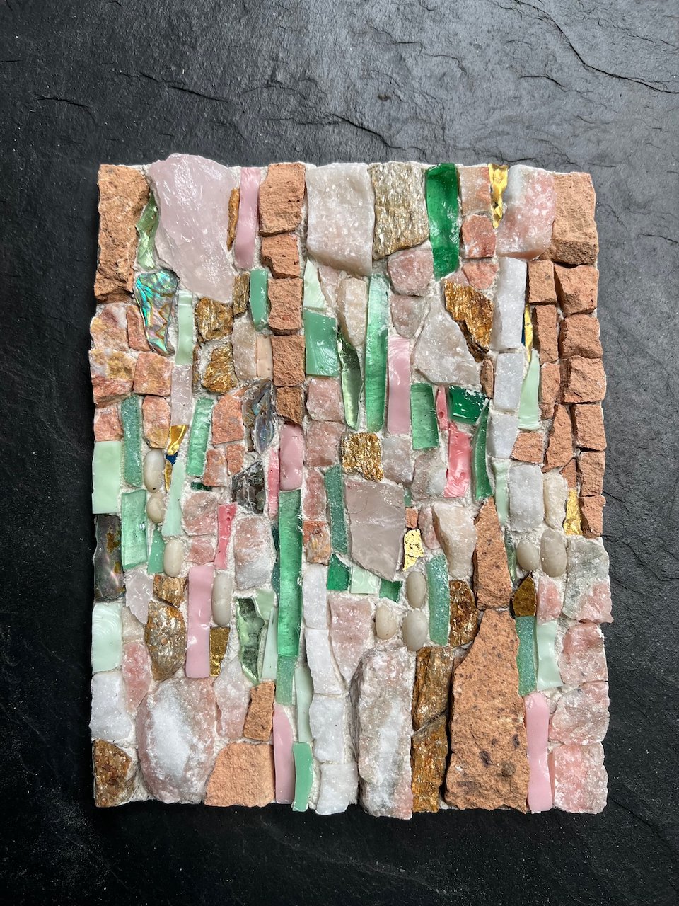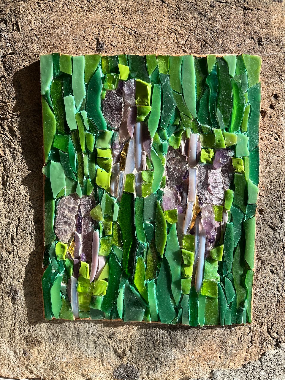 Depuis toujours je ramasse et collectionne les beaux cailloux. Grâce à la mosaïque, j’ai trouvé ma façon de les mettre en valeur, et d’y adjoindre d’autres matériaux de récupération (bois, charbon, mousses…) avec des matériaux plus précieux (or et smaltes de Venise, améthyste, disthène…)