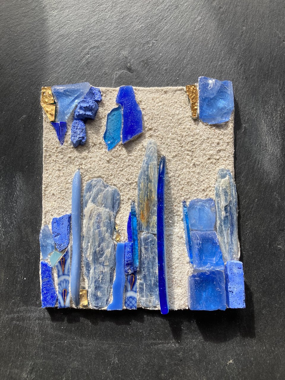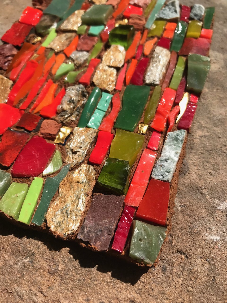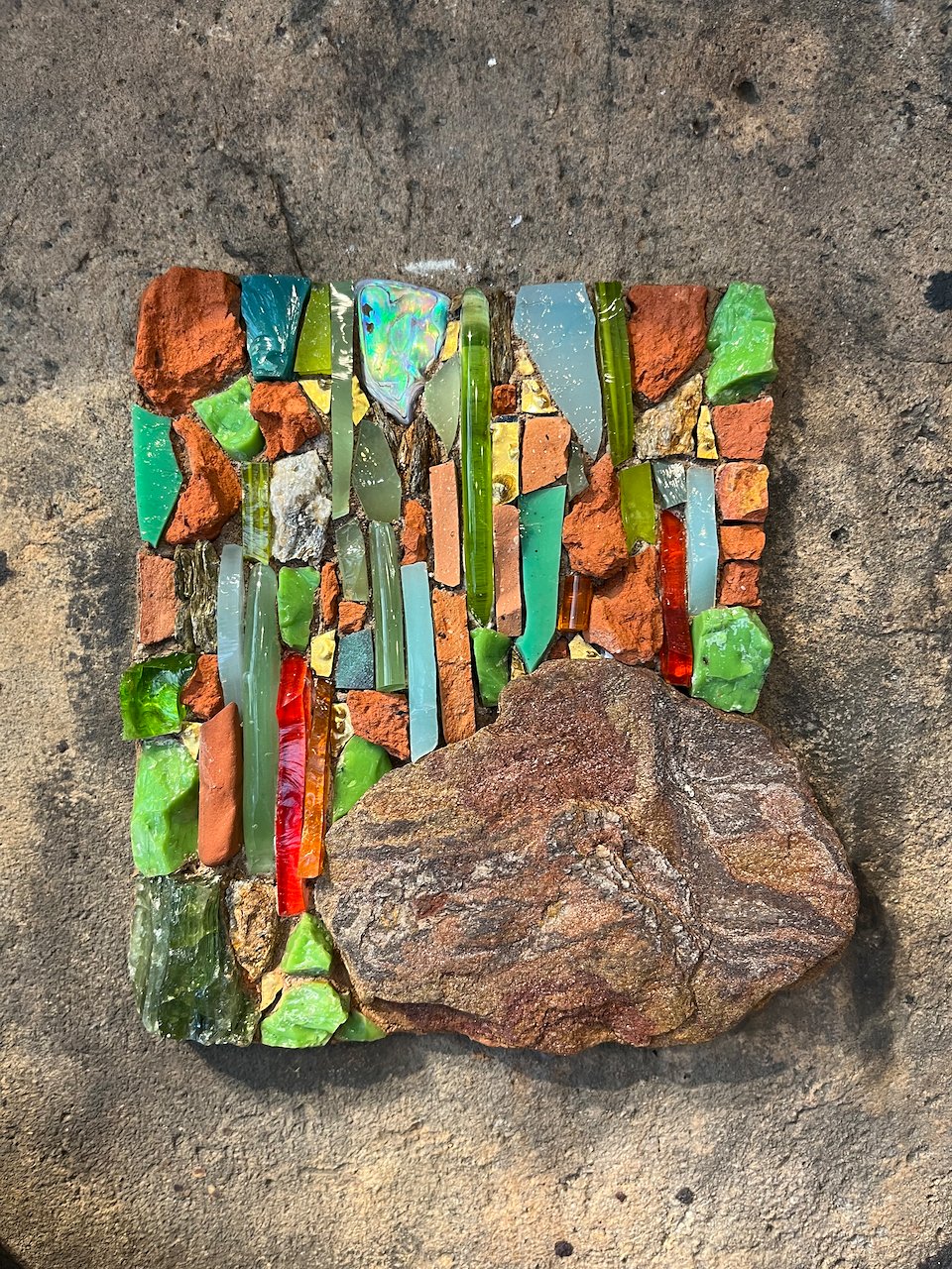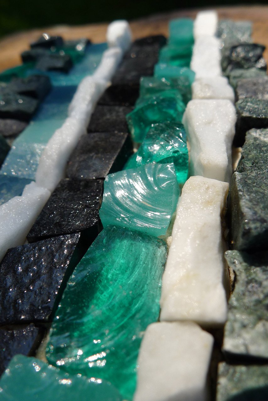 Depuis toujours je ramasse et collectionne les beaux cailloux. Grâce à la mosaïque, j’ai trouvé ma façon de les mettre en valeur, et d’y adjoindre d’autres matériaux de récupération (bois, charbon, mousses…) avec des matériaux plus précieux (or et smaltes de Venise, améthyste, disthène…)