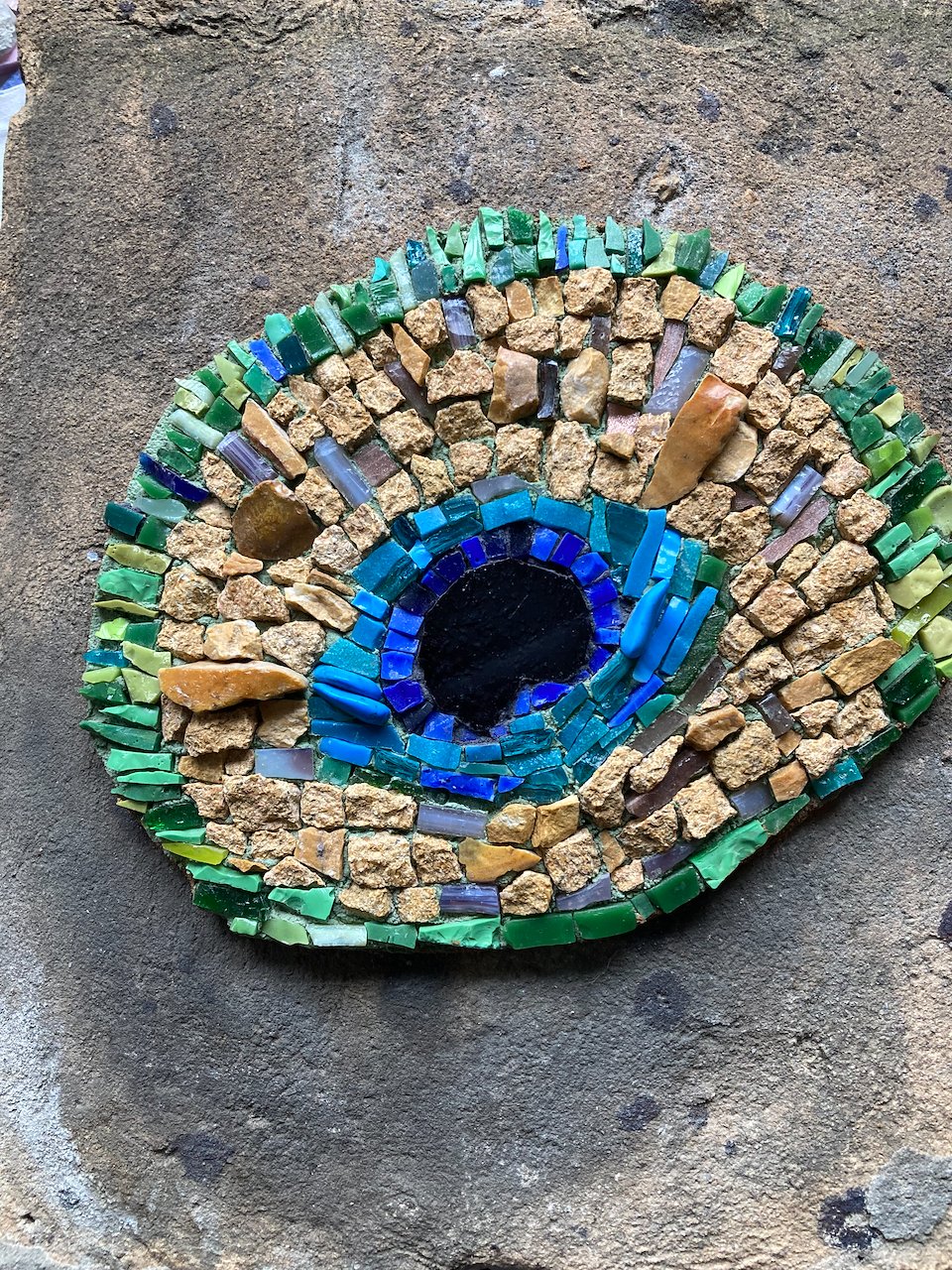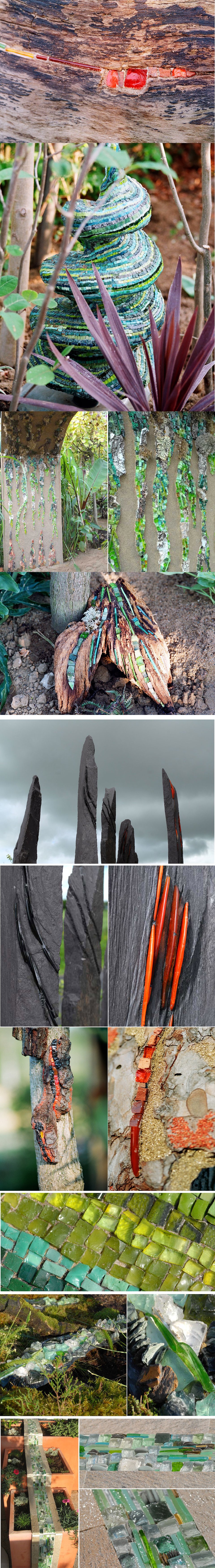 installations en mosaique, matériaux divers (marbres, pâtes de verre, matériaux de récupération…) – installation au Festival des Jardins de Chaumont sur Loire, au festival des jardins d’Emo Court (Irlande), et dans divers jardins privés